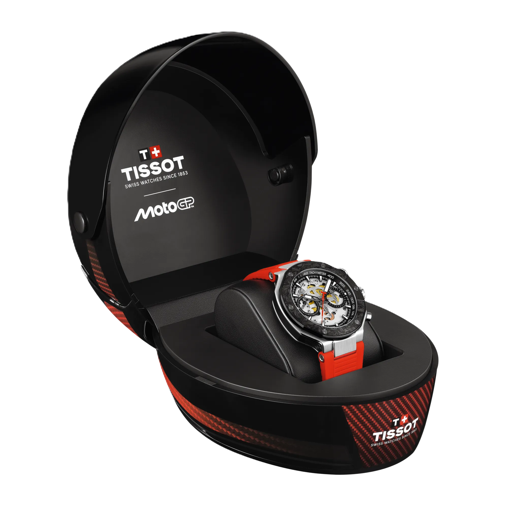 Auf weltweit 2.026 Exemplare limitiert, besitzt die Tissot T-Race MotoGP 2026 45mm kratzfestes, entspiegeltes Saphirglas sowie einen Sichtboden, der den Blick auf ihr Automatikwerk freigibt. Sie wird in einer charakteristischen Box in Form eines Motorradhelms geliefert.