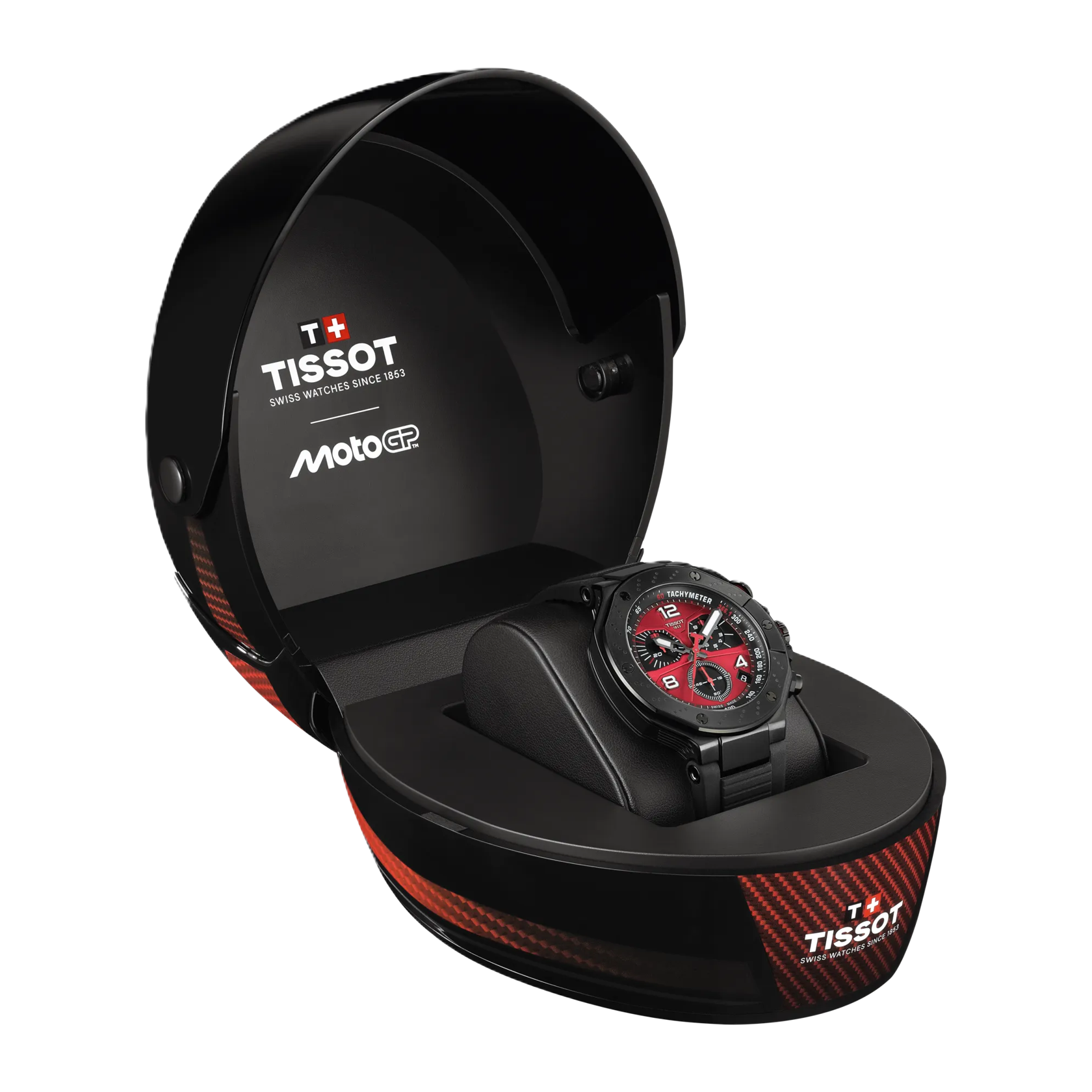 Wasserdicht bis zu einem Druck von 10 bar (100 m) und ausgestattet mit kratzfestem, entspiegeltem Saphirglas sowie markanten, mit Super-LumiNova®️-Leuchtmasse beschichteten Stunden- und Minutenzeigern, ist diese Uhr der ideale Begleiter für alle Motorradfans. Komplettiert wird sie von einem schwarzen Kautschukarmband mit Dornschließe. Die Tissot T-Race MotoGP 2026 45mm ist auf weltweit 8.000 Stück limitiert und wird in einer charakteristischen Box in Form eines Motorradhelms geliefert.